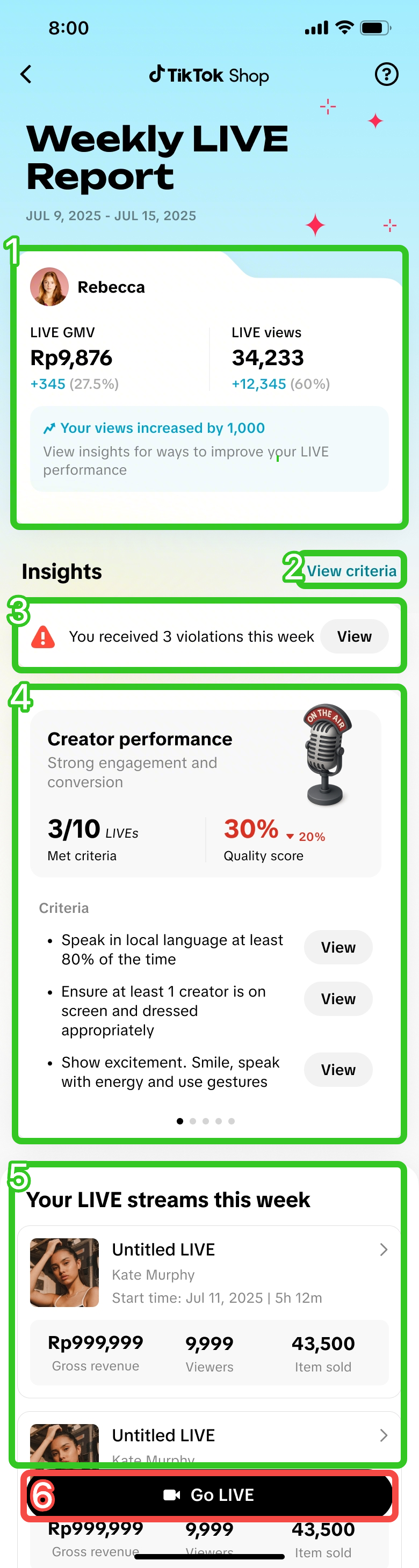 | | | 1. 查看直播违规记录 – 仅当所选统计周内存在直播违规行为时,才会显示违规提示。点击“查看”可浏览违规记录,规避后续直播出现同类问题。 |