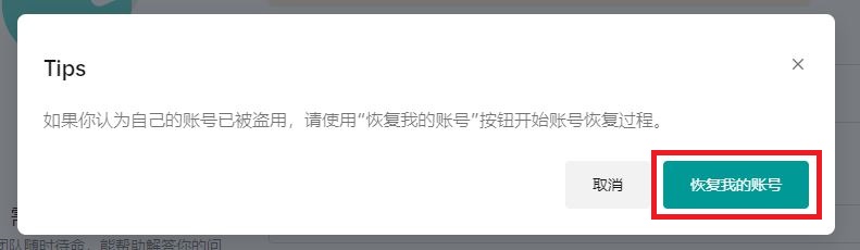 - 选择“账户已被盗用”后,会出现弹窗。点击“恢复我的账号”。